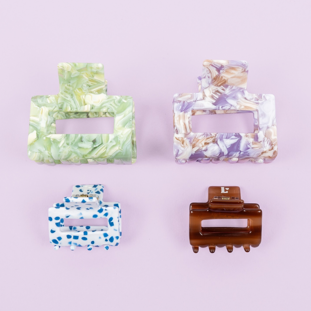 Unsere Haarspangen bestehen aus Celluloseacetat, einem pflanzlichen Biokunststoff mit ISCC PLUS-Zertifizierung. Im Vergleich zu erdölbasiertem Kunststoff ist Acetat nachhaltiger und biologisch abbaubar. Die Acetat- und Metallkomponenten wurden getestet und sind frei von Schadstoffen wie Blei, Cadmium und Phthalaten.