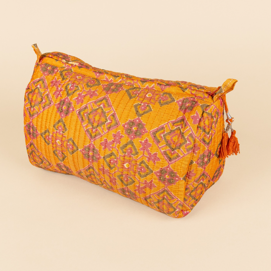 Die fröhlichen Drucke auf unseren Taschen und Kulturbeuteln werden mit einer jahrhundertealten Technik namens Blockdruck von Hand aufgedruckt. Mit Holzstempeln werden die Muster Stück für Stück auf den Stoff übertragen.