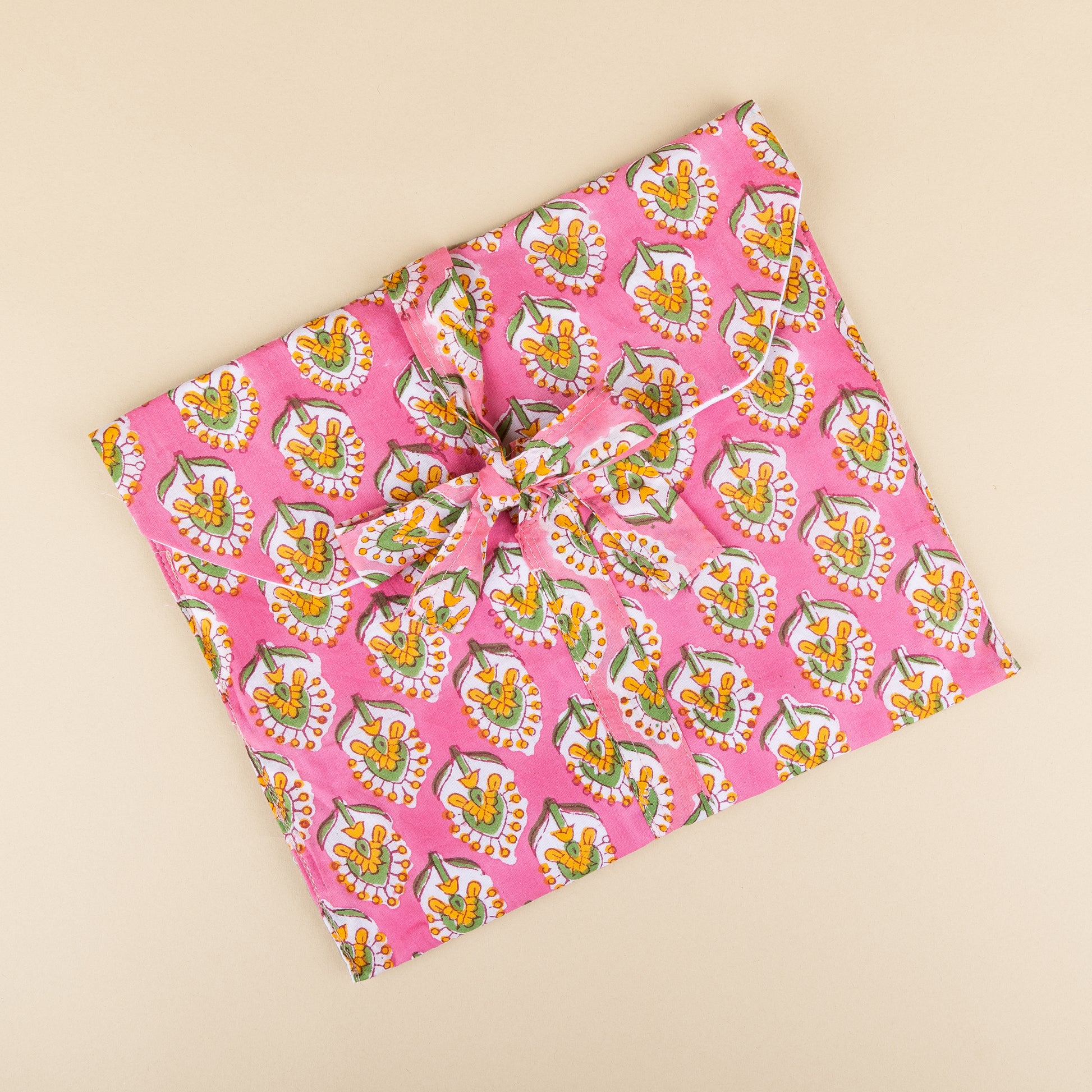 De vrolijke prints op onze tassen en toilettassen worden met de hand gedrukt volgens een eeuwenoude techniek: block printing. Met houten stempels worden de patronen één voor één op de stof gezet.