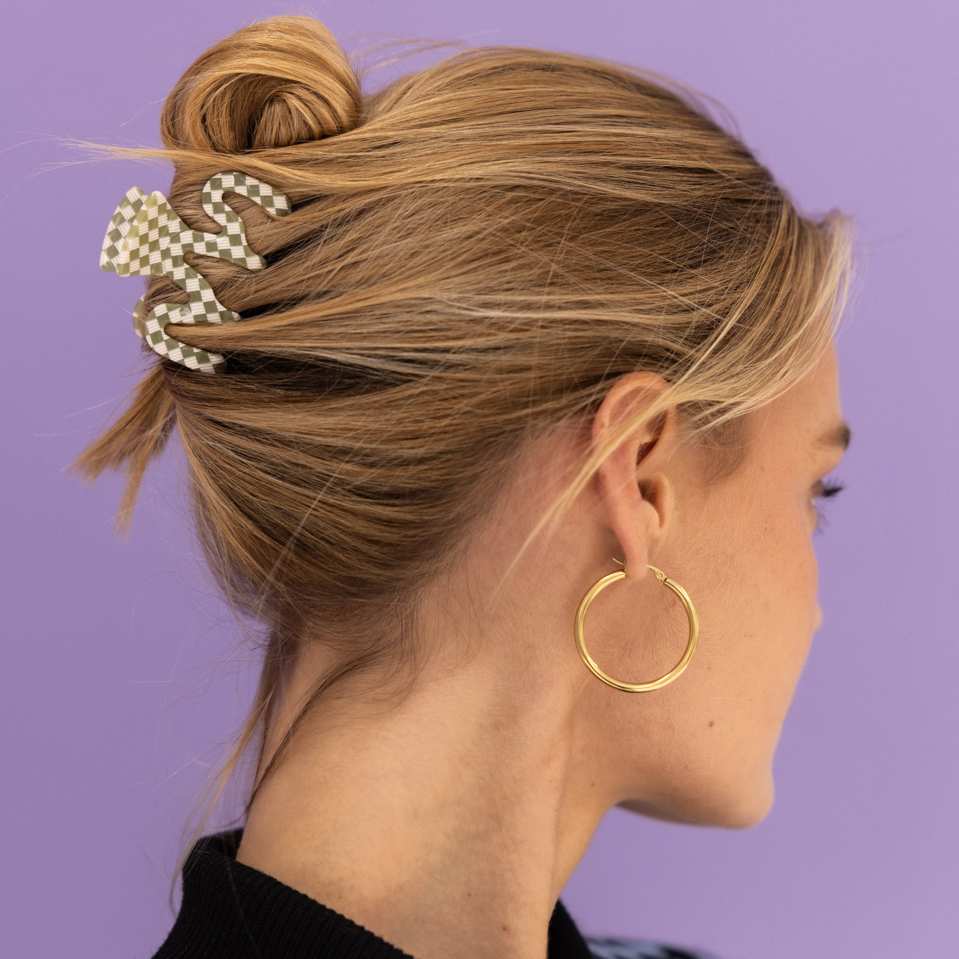 Our hair clips are made of cellulose acetate, a plant-based bioplastic certified by ISCC PLUS. Compared to petroleum-based plastic, acetate is more sustainable and biodegradable. The acetate and metal components have been tested and found to be free of harmful substances such as lead, cadmium, and phthalates.